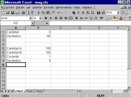 Ejemplo 1: Podemos utilizar la hoja de cálculo para probar estos casos y así poder entender mejor las escalas logarítmicas. Abrimos el programa (por ejemplo, Excel de Microsoft o Calc de OpenOffice), y en una hoja de cálculo nueva, ponemos en la celda A1 el rótulo "Cantidad:", y en A2 el rótulo "Decibelios:". De momento en la celda B1, escribiremos la cantidad "1000", y en la celda B2 teclearemos una fórmula para que nos dé los decibelios equivalentes a la cantidad que especificaremos en B1. Todas las fórmulas en Excel y Calc tienen que empezar por el signo "=", así que en B2 escribimos "=10*log10(B1)", todo seguido sin espacios. Al pulsar ENTER, debería salir el número 30, que indica que una cantidad de 1000 equivale a 30 db. Cambia en número 1000 por 100, y verás que corresponde a 20 db. Si pones una cantidad de 1.000.000.000.000 (un billón) le corresponde 120 db, que es lo máximo que aguanta el oído sin dolor. Nota: La función LOG10() es una función que da el logaritmo en base 10 de lo que esté entre paréntesis. Vamos a probar con cantidades menores que la unidad. Si en la celda B1 ponemos "0,1", veremos que corresponde a -10 db, y si introducimos una millonésima, es decir "0,000001", comprobaremos que equivale a -60 db. Por tanto una décima, al tener un decimal, cuenta como -10 db, pero una millonésima al tener 6 decimales equivale a -60 db. Resumiendo: las cifras mayores que 1 tienen db positivos y las menores que 1 tienen db negativos. Los decibelios vienen a ser el número de ceros (si cantidad> 1) o de decimales (si cantidad < 1) multiplicado por 10. Nota: No se pueden poner cantidades negativas. Prueba y verás que aparece error en la celda B2.