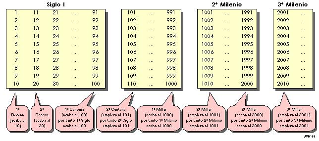 Una decena va del uno al diez. Una centena se compone de cien unidades, el número 100 incluido.Los mayas contaban los días del mes del 0 al 19 (y no del 1 al 20). Igualmente, el primer minuto de cada hora es el cero (por ejemplo 12:00), cuando han pasado los 60 segundos el reloj marca un minuto, que es el tiempo transcurrido (por ejemplo 12:01) y no el tiempo que está transcurriendo que sería el segundo minuto. Se podría hacer igual para medir las fechas, indicando un número de año anterior, un número de mes anterior, y incluso un día antes. Una vez acostumbrados sería igual de práctico que el sistema actual y de esta manera nunca tendríamos ningún problema para ponernos de acuerdo en que momento cambian los siglos y los milenios. Es preciso no olvidar que cuando se mide en unidades, ya sea de longitud, de superficie o de capacidad (y podemos considerar que el tiempo se mide en unidades de longitud por el movimiento uniforme de un cuerpo, como es el de las agujas de un reloj sobre una esfera, o incluso de capacidad en relojes de arena o agua), los números enteros expresan una cantidad de unidades desde el principio de la primera hasta el final de la última unidad, de manera que 100 años, es decir un siglo, representan el espacio de tiempo transcurrido desde el principio del año 1 hasta el final del año 100. Es preciso no confundir también los números cardinales con los ordinales. Cuando decimos 8 metros queremos indicar la terminación del metro que hace ocho, en cambio cuando decimos el metro 8º nos referimos a todos los puntos comprendidos en el metro que hace ocho. Así resulta que si restamos 3 unidades de 8 nos resultan 5, pero si tratamos de encontrar el número de unidades comprendidas entre los metros 3º y 8º encontramos 4 y es que en este caso se sobreentiende el principio del metro 8º y no el final, como cuando decimos 8 a secas. Por la misma razón en el año 2000 nos encontraremos ya en el año 100º del siglo XX pero no habrán transcurrido los 100 años o el siglo entero hasta la finalización completa del año 2000. Es de esperar que desde ahora quede aclarado porque el siglo XXI empieza a inicios del año 2001. En todo caso, después de toda esta exposición de detalles lo que no es demasiado aceptable es el razonamiento pseudo-científico, enraizado en algunos ámbitos, basado en que si el año tiene 365 días, existiendo un día de más cada año bisiesto, resulten, para la totalidad de un siglo, unos 25 días sobrantes, que multiplicados por 20 siglos, dan un exceso de tiempo en toda nuestra Era equivalente a 484 días: 1 año y 4 meses, de manera que llegaríamos mucho antes al siglo XXI. Al contrario, como hemos visto, estos años bisiestos sirven precisamente para corregir el calendario y mantenerlo en concordancia con la sucesión de las estaciones, es decir, con el Sol. De otra manera, acabaría coincidiendo la primavera del calendario con la caída de las hojas. Es, hasta a cierto punto, comprensible que existan ciertas dudas, pero si que nos interesa dejar claro que el cambio de milenio se produce en el año 2001, ya que es evidente que el cambio de las dos primeras cifras seculares de los números 1999 a 2000 parece turbar a gran número de personas. Es cierto que no es lo mismo este paso de las 999 milésimas como el cambio de 17 a 18, de 18 a 19, pero, para el que lo ha querido entender, no existe tampoco otra diferencia que la de 9 a 10 y del número 99 al 100, es decir, el complemento de la decena y la centena en el sistema métrico decimal. A pesar de las explicaciones que hemos ido desgranando hasta ahora, parece muy probable que la mayor parte de la gente, aún conociendo que el siglo y el milenio empiezan en el 2001, celebrará con más entusiasmo el inicio del año 2000 que no el 2001, redondear el número y hacer correr tres cifras llama más la atención (de la misma manera que nos llama la atención un fenómeno similar en el cuentakilómetros de nuestro coche). Personalmente creo que también será así, una parte de irracionalidad la tenemos todos, pero lo que es bien cierto, es que en este caso tampoco podemos huir de la racionalidad aritmética, creando verdades a nuestra medida. Por tanto existe otra posibilidad para celebrar el cambio de siglo y milenio que es hacer dos celebraciones, así contentaremos a todo el mundo y ¡Siempre son mejor dos que una! Lo que es bien cierto, es que, por ejemplo, en el día de nuestro aniversario, nuestros familiares y amigos nos felicitan a partir de las 00:00 horas del día de nuestro nacimiento y durante todo el día, a pesar de que a las 00:00 aún no cumplimos los años. Faltan unas horas, y incluso no sabemos cuantas exactamente debido a los cambios de hora de verano, las precesiones de los equinoccios, el meridiano local del hospital donde nacimos, el efecto de los años bisiestos,... Lo que es correcto es celebrarlo en el momento exacto pero para celebrarlo no hacemos lo que es correcto, hacemos sencillamente lo que todos acordamos hacer y nada más. Por tanto, a pesar de que el siglo XXI empieza el 1º de enero del 2001, eso no tiene nada a ver en brindar y celebrar el siglo XXI en otra fecha, de la misma manera que celebramos los aniversarios a partir de las 00:00 horas del día de nuestro nacimiento, o a veces lo hacemos días después, en fin de semana. Ser dueños del saber no significa que tengamos el derecho de discutir con el 99,9% de la población cuando celebrar ciertos aniversarios, aún teniendo la obligación de informar de la corrección de éstos. También se ha de admitir que resulta una paradoja, en una época en la que todo el mundo acaba adoptando el sistema métrico decimal, que en la medida del tiempo aún se mezclen ideas babilónicas, mitologías romanas, decisiones papales y otras invenciones peculiares. En el cómputo del tiempo coexisten sistemas de base 7, de base 12, o de base variable. Si no fuese por los insalvables trastornos que provocaría, adem