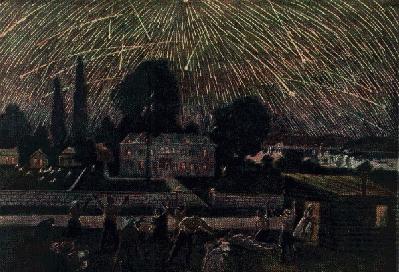 HistoriaLa historia de esta tormenta de estrellas fugaces va muy ligada al descubrimiento de la naturaleza del fenómeno. La noche del 12 al 13 nov 1833 una inusual actividad de meteoros (o estrellas fugaces) pudo obervarse desde América. Poco después de la puesta de sol se contempló una gran cantidad de meteoros. La actividad fue creciendo paulatinamente y tuvo su máximo nivel poco antes de la salida del sol, la madrugada del día 13. En ese momento, los meteoros inundaron todo el cielo, ofreciendo un espectáculo único y terrorífico para las gentes de la época. Agnes Clerke: "En la noche del 12 al 13 de noviembre de 1833 una tempestad de estrellas fugaces cayó sobre la Tierra. Todo el cielo estaba surcada de trazos y de majestuosos bólidos que iluminaban el cielo. En Boston, la frecuencia de los meteoros se estimó como la mitad de los copos de nieve que se ven en una fuerte tormenta".Aquella noche, muchas personas creyeron que había llegado el Día del Jucio Final. El hecho conmocionó a las gentes de aquella época. No en vano el historiador estadounidense R.M. Devens tenía en su lista a esta tormenta entre los eventos más importantes de EEUU. Devens escribió que "durante las tres horas del suceso, se creyó que el Juicio Final esperaba sólo a la salida del Sol y, aún muchas horas después del cese de la lluvia, los supersticiosos creían que el Día Final llegaría en sólo una semana". Este relato parece trasladarnos en el tiempo a las épocas de la Edad Media. Joe Rao afirma que para los EEUU la tormenta de las Leónidas de 1833 supuso una revitalización del fervor religioso que desde entonces y hasta nuestros días se han arraigado en forma de sectas. Pero el Apocalipsis de San Juan no se llegó a cumplir. ¿Cual era el origen real de los meteoros? Algunos periódicos se aventuraron a publicar algunas hipótesis. El diario Charleston Courier, por ejemplo, afirmaba que las estrellas fugaces eran gases, como el hidrógeno, que procedentes del Sol se incendiaban en la atmósfera debido a la electricidad o por la acción de partículas fosfóricas. El United States Telegraph de Washington (EEUU) tenía su propia teoría: "El intenso viento del Sur de ayer ha podido encontrarse con una masa de aire electrificado, que, debido al frío de la mañana, hizo descargar sus contenidos sobre la tierra".