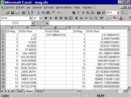 Ejemplo 5: Vamos a repetir la tabla que hemos hecho en el ejemplo 3, pero esta vez con el valor real del factor de brillo que hemos calculado en el ejemplo 4. Así tendremos la correspondencia exacta entre diferencias de magnitudes y las diferencias de brillo reales. En la celda F1 escribimos "Dif Mag". En la celda G1 ponemos "Dif Bri Real" para indicar esta vez la diferencia de brillo real y exacto. En la celda F2 ponemos la cantidad "1", en la F3 la cantidad "2", seleccionamos la celda F2 y la F3. Las dos quedarán dentro de un borde negro. Señalamos con el ratón en el cuadradito de llenado automático y arrastramos hasta la fila 35, generando la serie del 1 hasta el 34. En la celda G2 introducimos la fórmula "=D$2^F2". Al dar al ENTER, saldrá el número 2,51188643. Hacemos clic en la misma celda G2 y de nuevo cogiendo su esquina inferior hacemos llenado automático hasta la fila 35. Si en algunas celdas sale "#####" es que tienes que hacer más ancha la columna G, o bien disminuir el número de decimales. Y ahora ya tenemos la tabla de equivalencias exactas entre diferencias de magnitudes y diferencias reales de brillo. Fíjate que cada cinco magnitudes, el brillo corresponde a números redondos. Puedes comparar esta tabla con la otra. Sólo para diferencias de magnitudes muy grandes, la diferencia es apreciable. GeneralizandoYa sabemos como funcionan las escalas logarítmicas, y en concreto cómo funciona la escala de magnitud estelar. Podríamos generalizar nuestro conocimiento. Hasta ahora sabemos la diferencia de brillo real que hay entre dos estrellas de magnitud conocida, pero sólo de magnitudes enteras, como magnitud 3 ó 4. Pero en realidad hay estrellas que tienen un brillo intermedio entre estrellas de magnitud 3 y estrellas de magnitud 4. Por tanto esas estrellas tendrán que tener magnitudes con números decimales. Si tenemos una estrella de magnitud 2,7 y otra de magnitud 3,4 ¿cuántas veces es más brillante la primera que la segunda?. Pues tendremos que restar sus magnitudes y elevar 2,512 al resultado de esta diferencia. La fórmula matemática sería![]() El cociente de los brillos es igual al factor de brillo elevado a las diferencias de magnitudes.