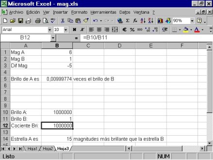 Ejemplo 7: En la misma hoja3, vamos a implementar la famosa fórmula de Pogson. Comenzando por los rótulos, en la celda A10 ponemos "Brillo A:", en A11 escribimos "Brillo B:", en A12 "Cociente Bri:", en A14 "Estrella A es", y en C14 escribimos "magnitudes más brillante que la estrella B". Vamos con los datos, en B10 ponemos 100000, en B11 ponemos 1000. Sólo faltan las fórmulas: en B12 escribimos "=B10/B11", que nos dará un resultado de 100 pues el brillo de la estrella A (100000) es 100 veces el brillo de la estrella B (1000). En la celda B14 ponemos la fórmula de Pogson "=2,5*log10(B12)".