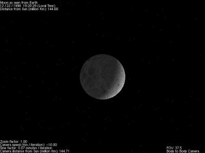 La Luna vista desde la Tierra el 22 de diciembre de 1998.Como astrónomo aficionado que soy (aunque he de reconocer que más bien teórico) utilizo de vez en cuando un programa de efemérides. Si bien estos son de gran utilidad práctica, siempre los he considerado un poco pobres en el aspecto visual (al menos los que yo conozco). Entonces pensé que estaría bien hacer que ssystem pudiese ser utilizado para ver el sistema solar desde cualquier punto del mismo y en cualquier fecha, y que además la calidad gráfica fuese tal que uno pudiese ver en el ordenador algo parecido a lo que realmente vería si estuviese realmente allí. No cabía duda de la gran magnitud del proyecto y de que probablemente llevaría meses o de que incluso nunca llegaría a acabarse del todo, pero tampoco había prisa. Poco a poco pude ir añadiendo estrellas reales (basadas en el catálogo de Yale), un algoritmo para el cálculo de las posiciones de los planetas en una fecha dada (no muy preciso pero no estaba mal para empezar), algunos satélites, texturas más realistas, mayor calidad gráfica, mejor rendimiento, soporte para joystick y ratón, varios tipos de cámaras y alguna que otra cosa más. Por supuesto aún quedan muchas cosas por hacer, entre ellas eclipses, cometas, asteroides, un buen interfaz de usuario, gravedad, mas estrellas, objetos del espacio profundo y, en general, cualquier idea que se me vaya ocurriendo o que sea sugerida por los usuarios.